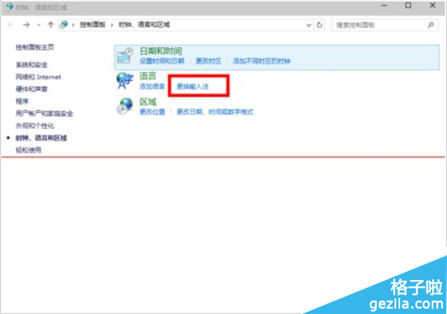 3、在“时间、语言和区域”窗口中 我们点击“更换输入法”