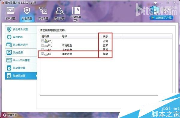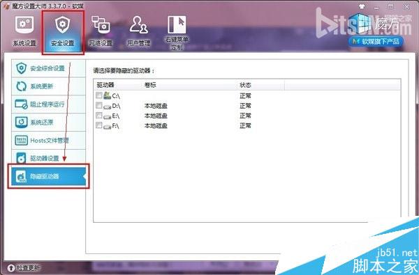 2、如下图所示,在魔方设置大师中,选择:安全设置-->隐藏驱动器。