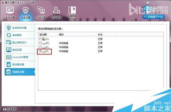 3、如下图所示,在隐藏驱动器的选择中,选择你需要隐藏的某个硬盘分区,例如本例中选择F盘隐藏。在需要隐藏的硬盘驱动器前面勾选,然后直接点击保存设置。