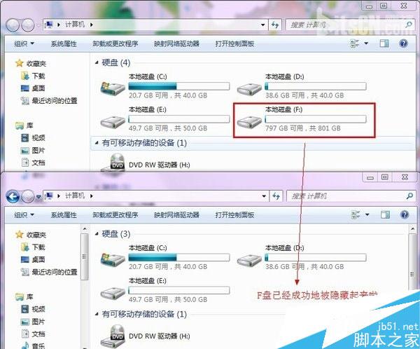 4、此时再打开我的电脑,对比之前的截图,看看是不是硬盘分区已经成功地被隐藏掉了,原来存在的F盘已经不见了!