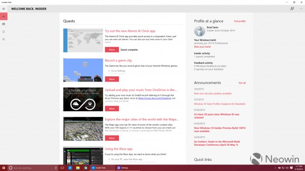 昨天晚些时候,Windows 10 Build 10114来到了人们的面前,而在这个版本中,我们竟然见到了全面改版后的Insider Hub。全新的汉堡菜单和Modern布局,使得该应用看起来已经和系统上的其它应用更加融洽。布局和组织更新是本次调整中变化最大的,比如“任务”(Quests)就已经被放到了前方居中的位置。(该功能旨在帮助大家完成简单的任务,以熟悉微软的操作系统)
