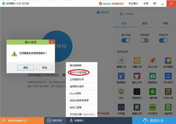 4、改成不同于当前数值(数值1和数值0互换)后,点击确定,直接重启文件管理器explorer.exe进程(可以用软媒魔方轻松实现)后,修改生效。