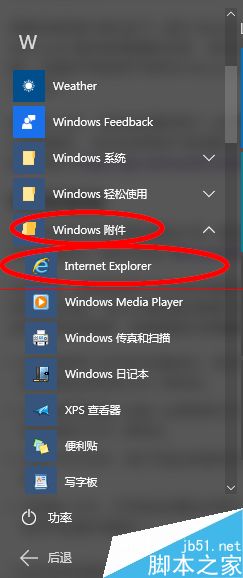 2、在所有应用列表中选择“windows附件”,IE浏览器就在这个列表中
