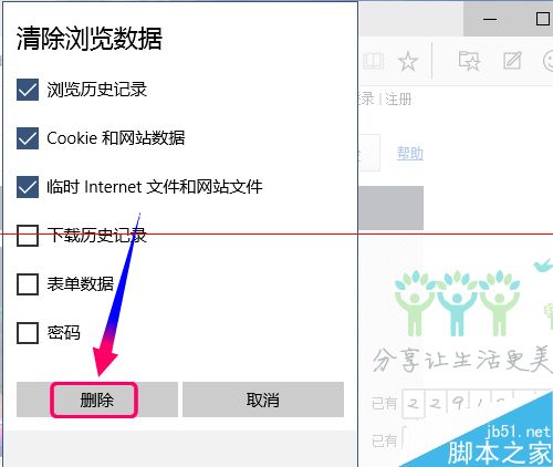 6、点击[清除浏览数据],弹出对话框选择你需要清除的内容项目,点击[删除]