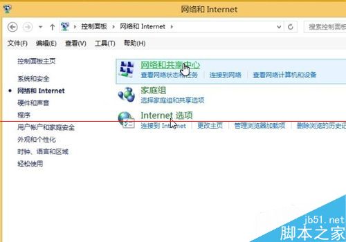 3、网络和internet界面下面,鼠标选择网络和共享中心,左键单击进入