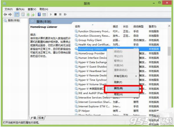 找到“HomeGroupListener”服务,双击打开或右键单击“属性”命令。