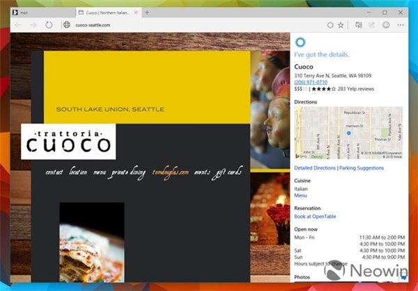 Project Spartan内置了Cortana,不过相对比较“安静”,只有在有相关信息时提示你,比如说访问餐厅的网站,Cortana会提示找到更多信息。也可以右键中Ask Cortana主动激活Cortana来查询。