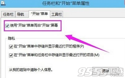 2、点击开始菜单,再把"使用开始菜单而非开始屏幕"勾上再点击确定。