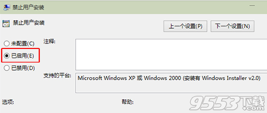 第三步、在禁止用户安装界面,点击选择“已启用”后,点击底部确定即可!