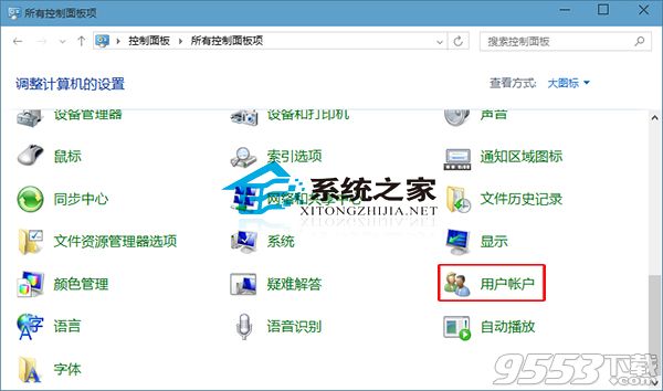 第一步、打开控制面板,在大图标查看方式下,找到并点击“用户账户”。