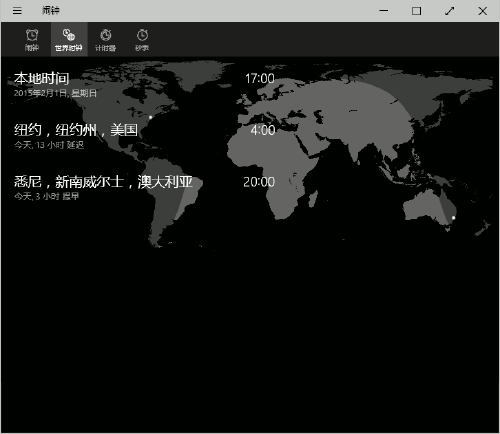 注:闹钟应用提供“闹钟”、“世界时间”、“计时器”、“秒表”四大功能。
