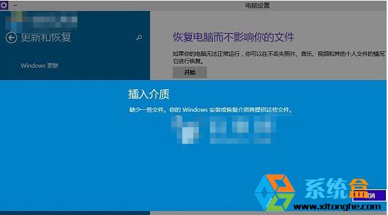 5、这时会弹出让我们插入介质的提示,原因就是恢复 win10系统需要Win10安装光盘或安装U盘,想必安装过的朋友都会有保存原来的安装光盘或U盘,没有的话可以使用win10原版ISO制作一个安装U盘。使用UltraISO类软件,将win10 ISO打开,然后写入到U盘。