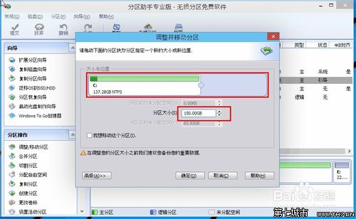 2、来到此对话框,此时我们可以调整分区大小。然后当鼠标指针变成双向箭头时,拖动直到你满意的容量位置。这里C盘已经被操作为150GB。之后点击“确定”。