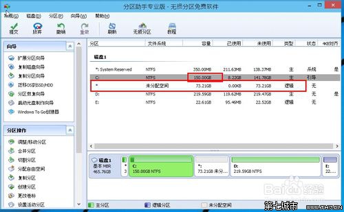 3、返回到了主界面,至此win10分区c盘太大这时C盘已经变为150GB,在此也出现了一个“未分配空间”。