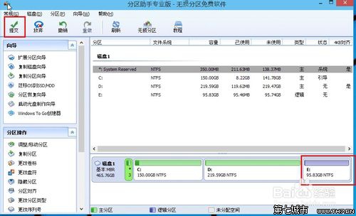 5、合并分区之后E盘有大约95GB。所以操作完成之后,点击左上角“提交”电脑才会为您进行分区大小调整及分区合并任务。