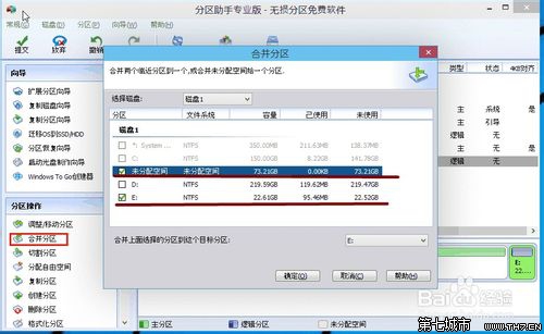 4、如果你还想对这个未分配空间进行利用,我们可以看到E盘空间很小只有大概22GB,这个时候我们就可以把这部分“未分配空间”合并到E盘。首先选中E盘,点击左边任务栏的“合并分区”。