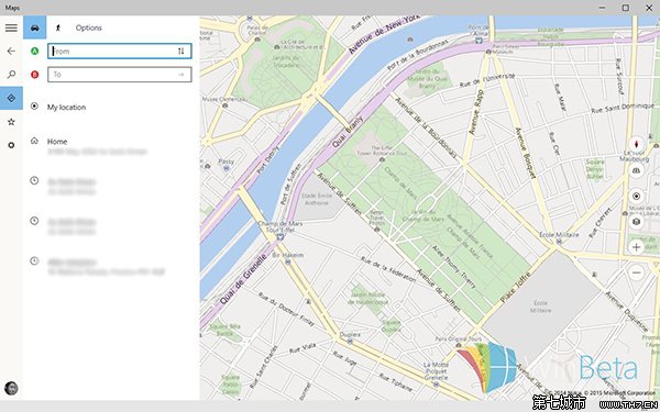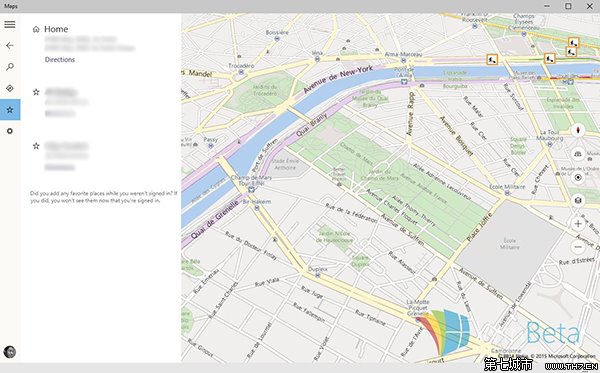 新Win10预览版的地图界面也进行了简化,设计更加简洁。你可以改变地图的视角和方向,找到“我的位置”,控制变焦。右边是一个侧边栏,让你可以访问搜索,收藏夹和设置。