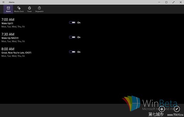 在更新Win10预览版9926后,我们感觉微软应该把“闹钟”这个应用名字改成“时钟”。该应用程序现在包括四个选项卡:闹钟,世界时钟,计时器和秒表。按钮也换成了圆润的造型。