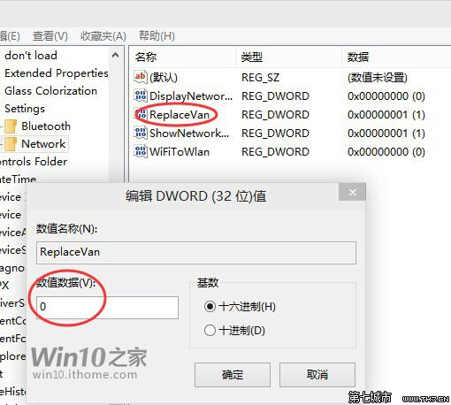▲然后再注册表编辑器里的Network文件夹双击“ReplaceVan”,在弹出的窗口中将“数值数据”由默认的1改为0,单击“确定”退出。