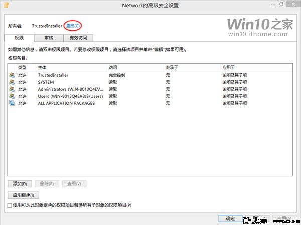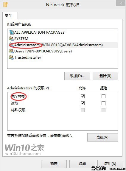 ▲点击“确定”关闭“Network高级安全设置”窗口后,在“安全”选项卡中选择“Administrators”(管理员)标签,确认“完全控制”被钩选,然后点击“确定”应用修改。