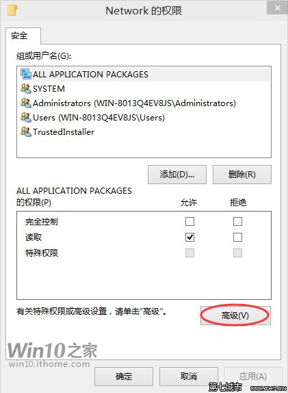 ▲在弹出的“权限”窗口中,点击下面的“高级”按钮