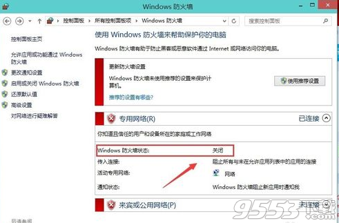 2、点击左侧的“启用或关闭Windows防火墙”