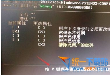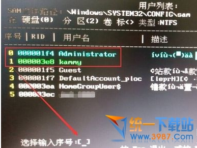 查看你要清除密码的用户名。然后把它前面的序号输入到下面的选择输入序号那里。再回车。进入下一个界面后再按一下Y
