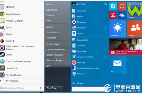 而即便忽略掉动态磁贴,开始菜单看上去依然不对劲。在默认下,它的色彩会根据系统主题而变化,但这同时也是Windows10当中唯一会适配系统主题的菜单。把它和Windows7直接对比你就会发现,后者仅更易阅读,同时也显得更加紧凑。