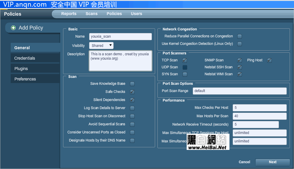 要进行安全评估,则首先要制定扫描策略,然后添加扫描范围,才能进行扫描,扫描完毕可以查看报表。就是上面说的几个按钮的用途。下面我们增加扫描策略:Policies→Add
