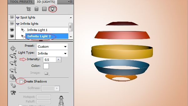 11.选择灯光1和2,去掉阴影和增强一点强度。