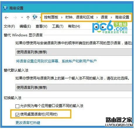 首先确保在控制面板中已经选中了“使用桌面语言栏”,具体方法: