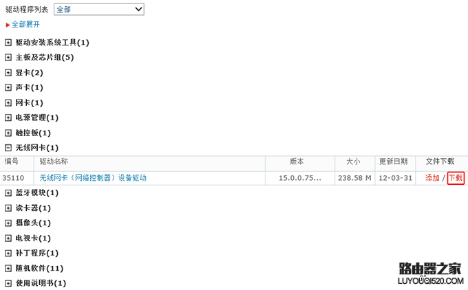 3.4 然后展开“无线网卡”,根据实际情况选择并点击如下图所示的“下载”链接。如下图所示: