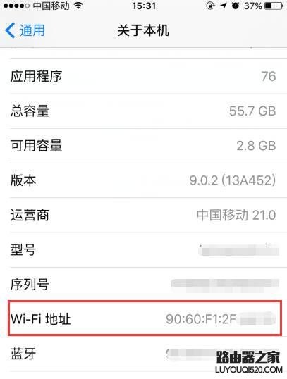 打开手机,点击【设置】——【通用】,找到【关于本机】——找到【WiFi地址】就是你手机的MAC地址啦~(以iPhone为例)。