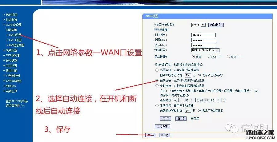 (5)点击左侧“网络参数—WAN口设置”,选择自动连接,在开机和断线后自动连接。保存。