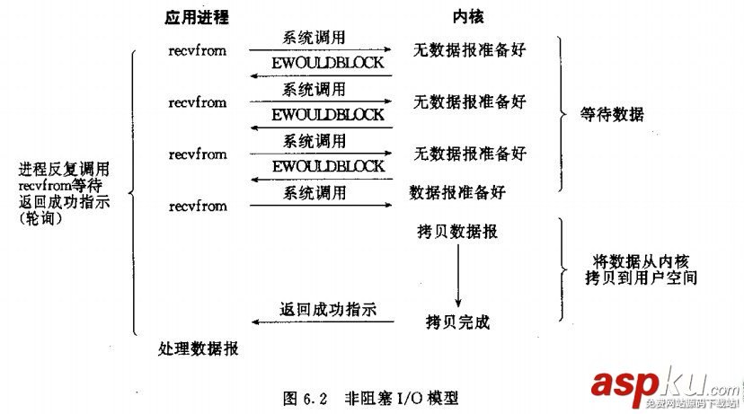 我们把一个SOCKET接口设置为非阻塞就是告诉内核,当所请求的I/O操作无法完成时,不要将进程睡眠,而是返回一个错误。这样我们的I/O操作函数将不断的测试数据是否已经准备好,如果没有准备好,继续测试,直到数据准备好为止。在这个不断测试的过程中,会大量的占用CPU的时间。