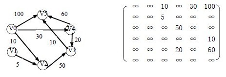 (1)假设用带权的邻接矩阵edges 来表示带权有向图,edges[i][j] 表示弧〈vi, vj〉上的权值。若〈vi, vj〉不存在,则置edges[i][j]为∞(在计算机上可用允许的最大值代替)。S 为已找到从v 出发的最短路径的终点的集合,它的初始状态为空集。那么,从v 出发到图上其余各顶点(终点)vi 可能达到最短路径长度的初值为: