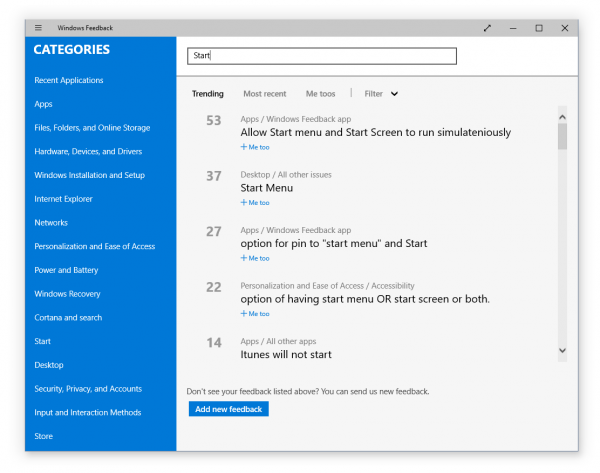 Windows Feedback和Insider Hub应用: 这两款应用已经得到了改善,你能够根据推荐过滤你的反馈,并直接从搜索结果增加“Me too”(我也赞成)的选项。应用的整体性能得到进一步改善,在Feedback Hub上访问“Your Progress”页面追踪你有多少的贡献。