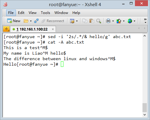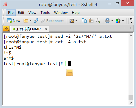 再用sed替换windows下创建的a.txt, 将其中一行的换行符^M$中的^M去掉,变成linux的换行符$