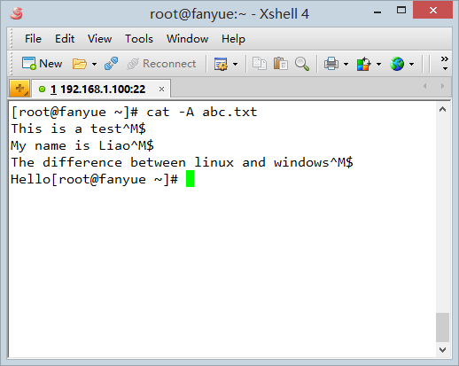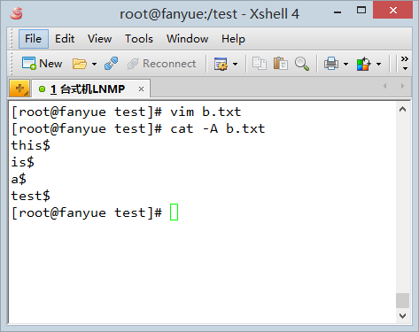 我在linux下用vim编辑一个新文件,内容和刚刚的a.txt一样,用cat -A查看: