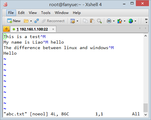 那么为什么有的时候windows下创建或编辑的文件在linux下会出现^M呢,vim不是能自动识别吗?这是因为,vim会检查文本的每一行换行符,只要有一行的换行符不是windows格式,那么vim就会以unix文件格式来显示文件,这时换行符为$, 因此我们会看到文本的行后面多了一个^M符号。