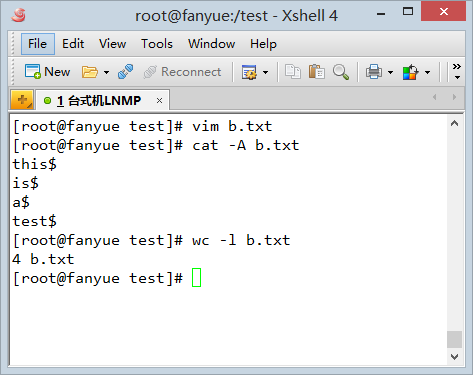 可以看到linux下创建的文本,每一行都是有换行符的,包括最后一行,用wc -l统计行数: