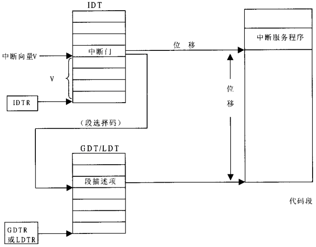 中断描述符表是一个系统表,它与每一个中断或异常向量相联系,每一个向量在表中有相应的中断或异常处理程序入口地址。