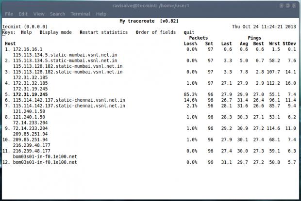 $ sudo apt-get install mtr (On Debian based Systems) # yum install mtr (On Red Hat based Systems)现在运行mtr命令,开始查看mtr运行的主机和google.com直接的网络连接。