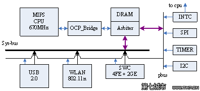 这是一块单独的芯片,而其几乎包含了一个完整的PC机主板上的所有内容,CPU的功能还是很强劲了,670MHz的MIPS核,通过桥片连接数据总线。这里的sys_bus差不多相当于PC中的PCI总线,诸如USB控制器等都挂在其下。这里主要看一下网络设备,主要有两个,一个802.11n标准的WLAN收发器,一个4FE+2GE的以太网交换机。