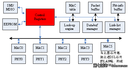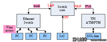 大家应该看得出来,这是一个DSL芯片。其网络部分由一个switch core构成核心,对外有3个交换口(粉红色的):左侧为以太网MAC,可外接以太网芯片MAC或PHY,称为LAN端;右侧为DSL的TPS子层,按照DSL标准传输ATM/PTM数据,成为WAN端;上面的是一个PDMA片级总线,与片上系统SoC通信。