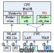 这里比较特殊的是这个SWC设备,照理它的所有端口应该是等价的,所处网段也相同,但通过VLAN技术,把3、4、CPU端口化为一个VLAN,而5、CPU化为另一个VLAN,这是SWC硬件支持的port-mapping,它能只允许同一个VLAN下的机器通信。这里就有一个特殊的CPU端口,它同属于两个VLAN,称为trunk,SWC硬件在trunk口下收发数据时,必须带有vlan_tag(802.1q)。在CPU系统内,因为物理通路只有一个,只能通过软件的方式来实现VLAN的划分(如Linux下的VLAN)。另外,一般把wlan挂在LAN内,所以在Linux中可以用一个虚拟Bridge设备来连接这两个设备。下面来看几种数据交换的途径: