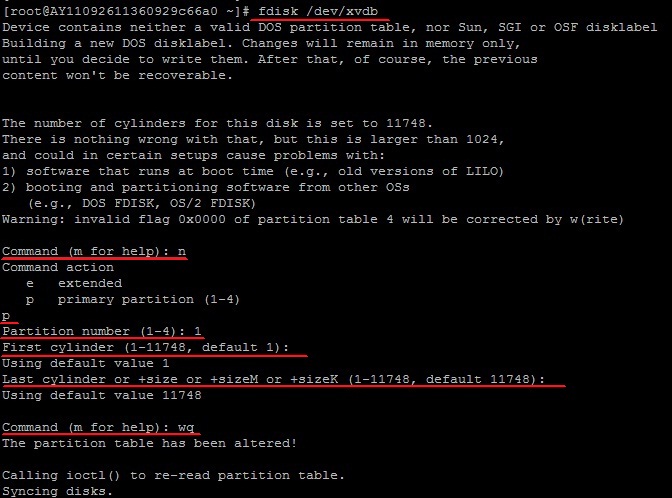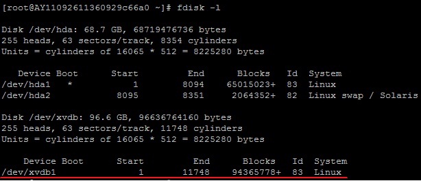 使用“fdisk -l”命令可以看到,新的分区xvdb1已经建立完成了。