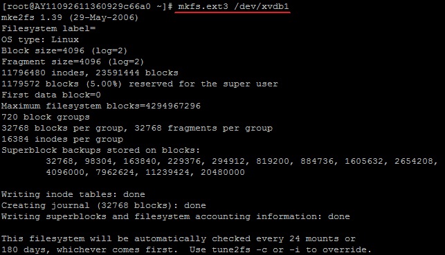 使用“mkfs.ext3 /dev/xvdb1”命令对新分区进行格式化,格式化的时间根据硬盘大小有所不同。