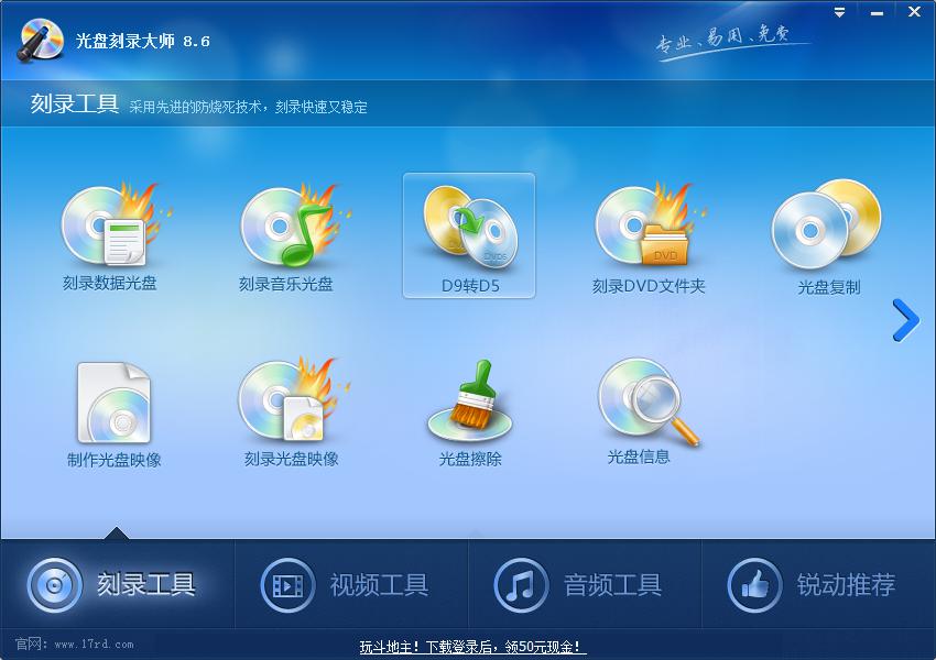 光盘刻录大师是一款操作简单,功能强大的刻录软件,不仅涵盖了数据刻录、光盘备份与复制、影碟光盘制作、音乐光盘制作等大众功能,更配有音视频格式转换、音视频编辑、CD/DVD音视频提取等多种媒体功能。