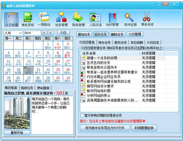 稻草人时间管理软件是集融事业规划、时间管理、财务管理和人际管理于一身,帮您建立一个生活和事业的管理中心,稻草人时间管理软件是根据美国头号绩效管理专家斯蒂芬·柯维的《成功人士的七个习惯》和《要事第一》改编的生活和事业管理第四代时间管理软件。软件的界面友好,操作简单,功能非常的强大。
